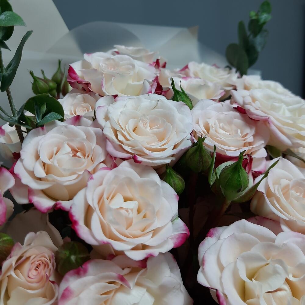 Роза кустовая – 7 шт.Эвкалипт – 2 шт.Упаковка дизайнерская – 2 шт.