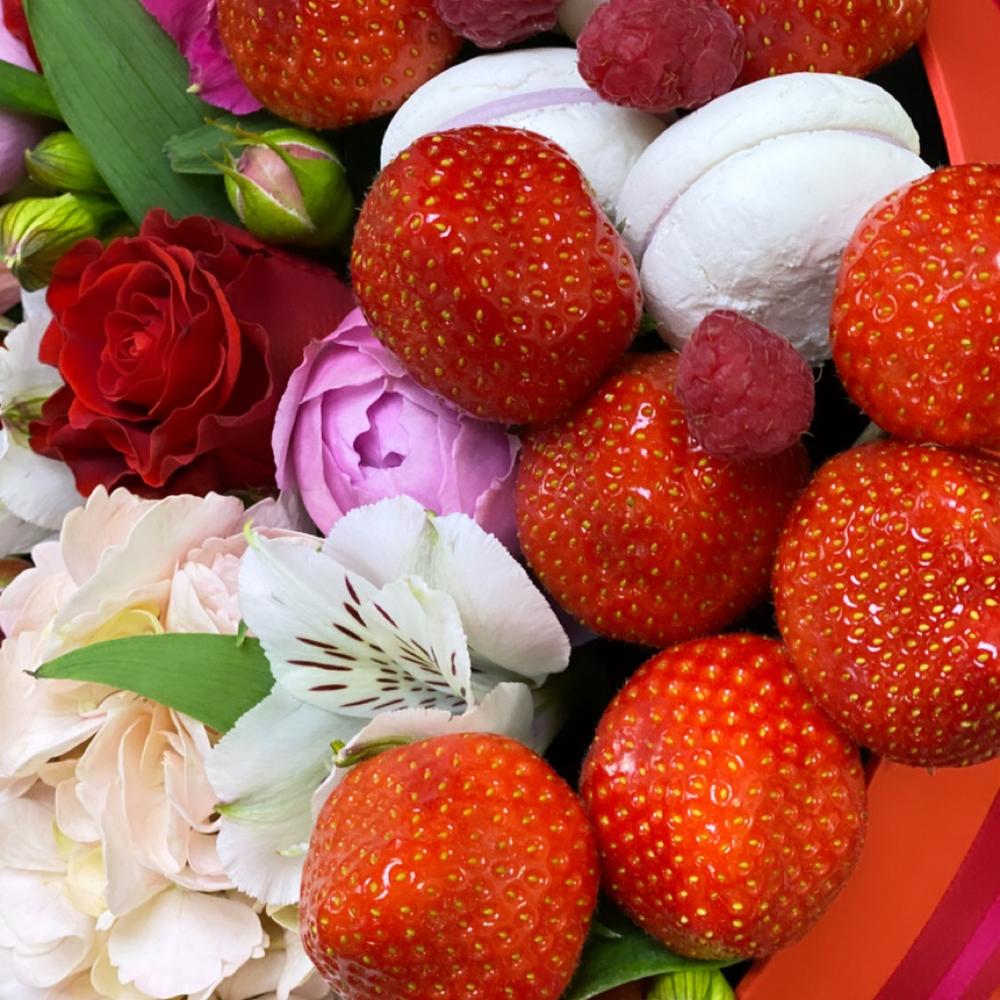 Альстромерия – 3 шт.Гортензия – 2 шт.Клубника – 9 шт.Роза красная – 5 шт.Оазис – 1 шт.Коробка – 1 шт.Пирожные макарон – 3 шт.роза мисти бабл – 2 шт.