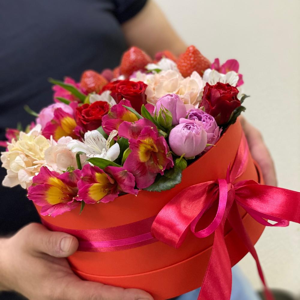 Шикарная композиция из любимых цветов с ароматной клубникой и вкусными пирожными!Смотрится эффектно! ❤️❤️❤️