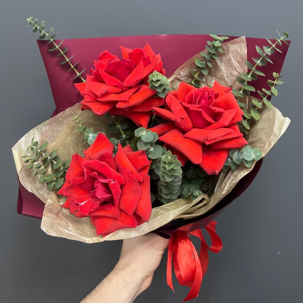 Лента атласная – 1 шт.Тишью – 1 шт.Эвкалипт Baby Blue – 3 шт.Упаковка корейская пленка – 1 шт.роза французская алая нина – 3 шт.