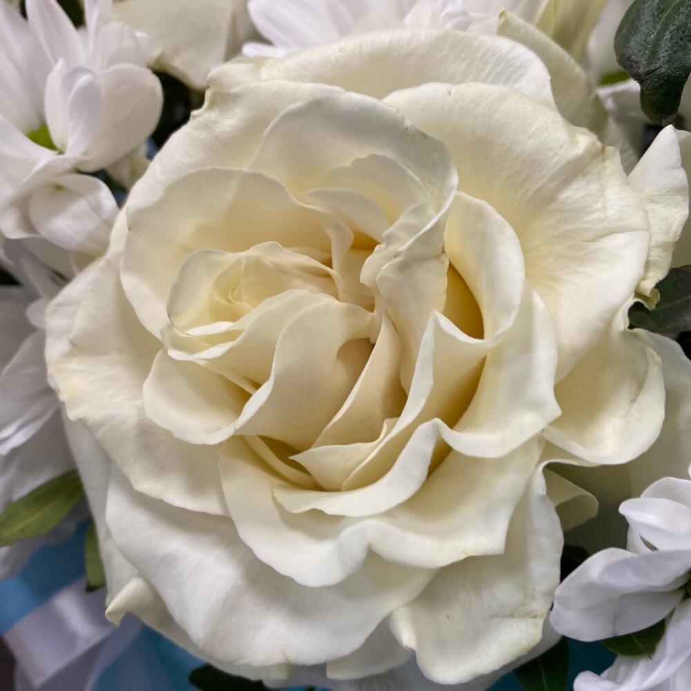 магнум белый – 1 шт.Роза – 3 шт.Лимониум – 2 шт.Ромашка кустовая – 3 шт.гиппеаструм – 1 шт.Зелень – 5 шт.Коробка шляпная – 1 шт.Оазис флористический – 1 шт.Лента атласная – 2 шт.