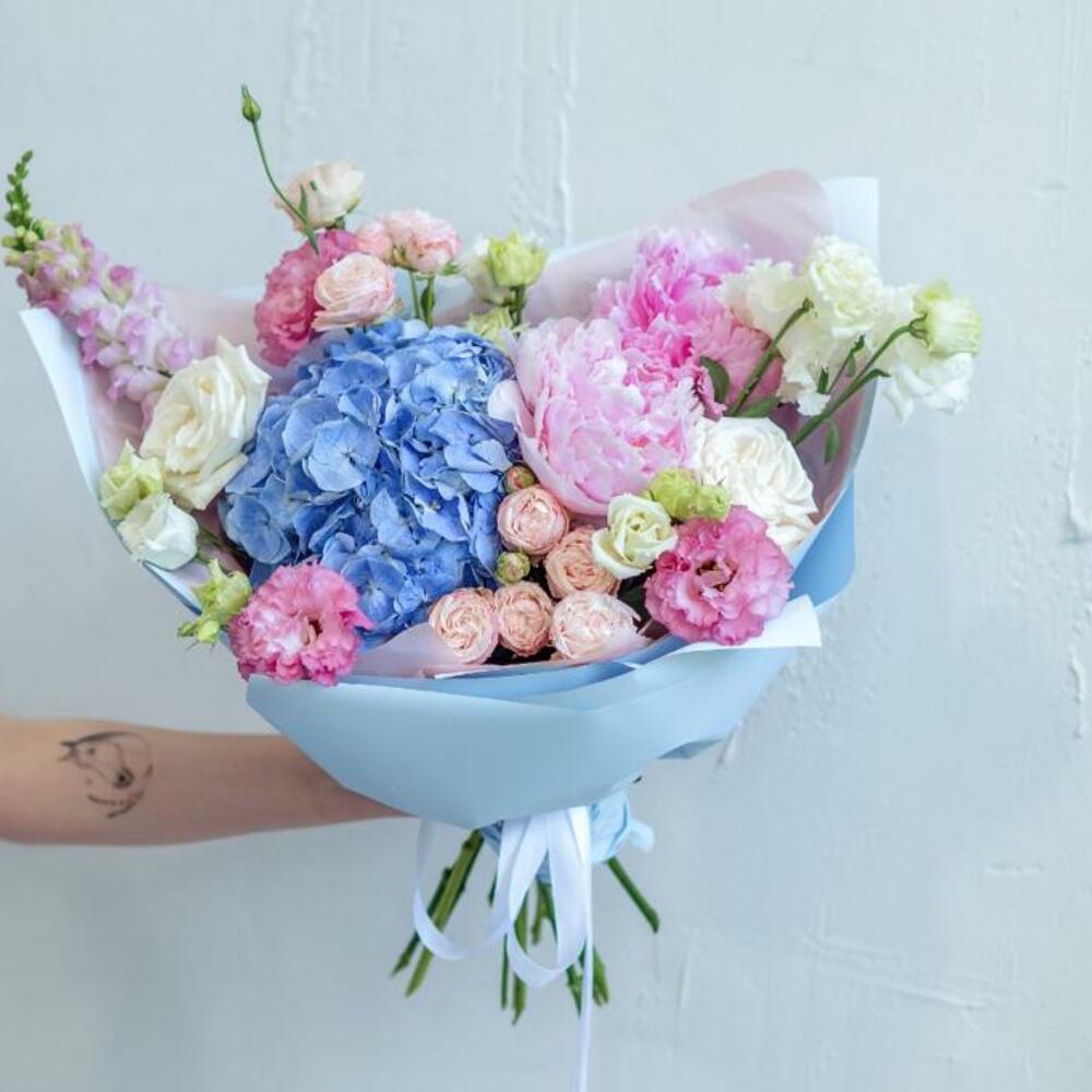 Гортензия – 1 шт.Пион – 2 шт.Лизиантус – 4 шт.Роза кустовая – 3 шт.Антуриум – 1 шт.роза плая бланка – 2 шт.ветки фистошки – 2 шт.Дизайнерская упаковка – 1 шт.