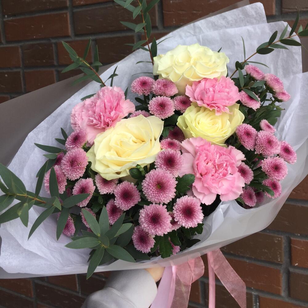 Роза – 3 шт.Гвоздика – 3 шт.Хризантема кустовая – 5 шт.Эвкалипт – 2 шт.