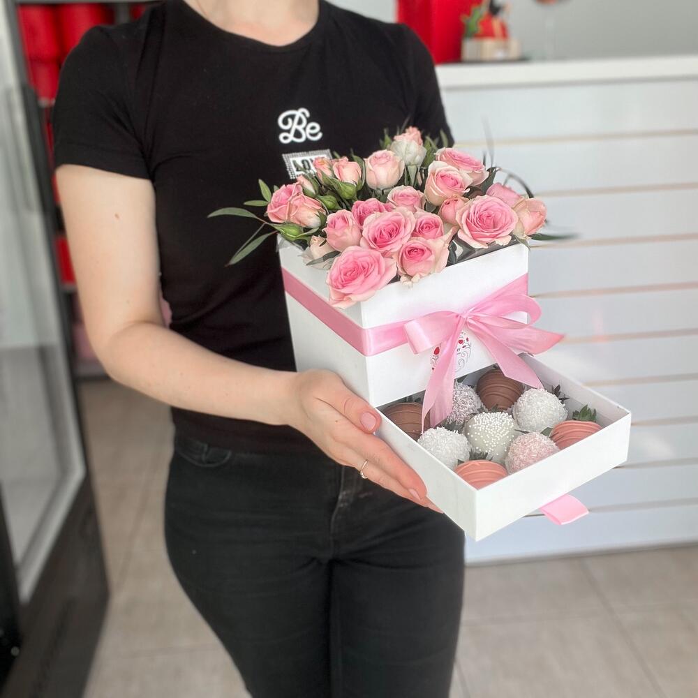 Мини шкатулка с кустовыми розами (9 клубничек в шоколаде)