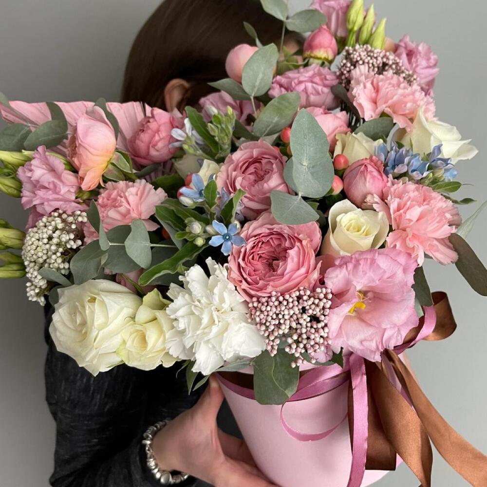 Диантус – 5 шт.Кенийская роза – 7 шт.Оксипеталум – 3 шт.Эвкалипт – 1 шт.Гиперикум – 2 шт.джульетта роза пионовидная – 3 шт.Оазис флористический – 2 шт.Коробка шляпная – 1 шт.Лизиантус – 2 шт.Лист пальмы – 1 шт.Озотамнус – 3 шт.