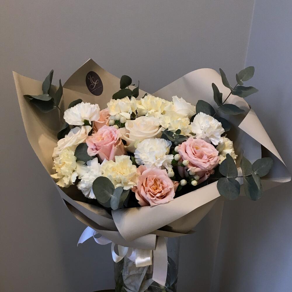 шимер роза – 3 шт.Гвоздика сортовая – 7 шт.Гиперикум – 2 шт.Эвкалипт – 3 шт.Венделла – 2 шт.