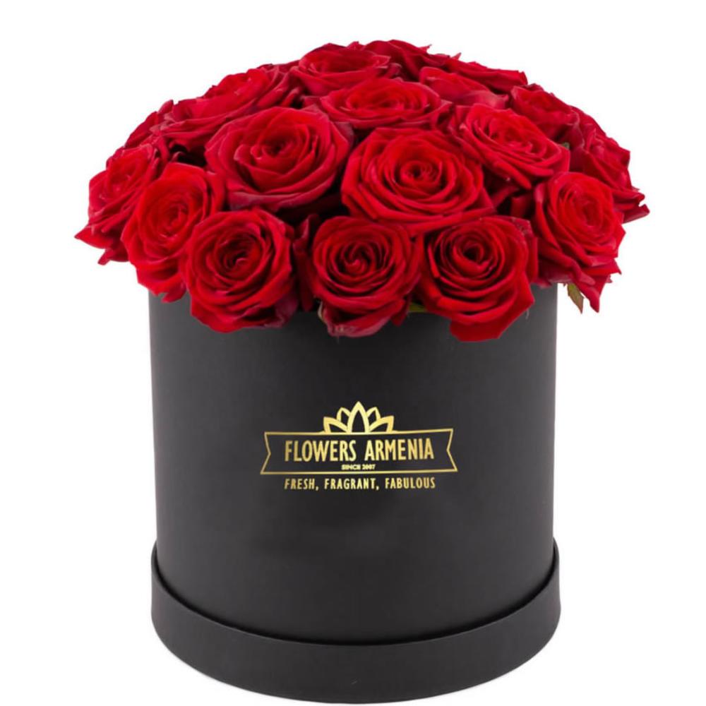 Красные розы 35 шт. сорта «Эксплорер» в черной каробке. Размер 25×35 см.