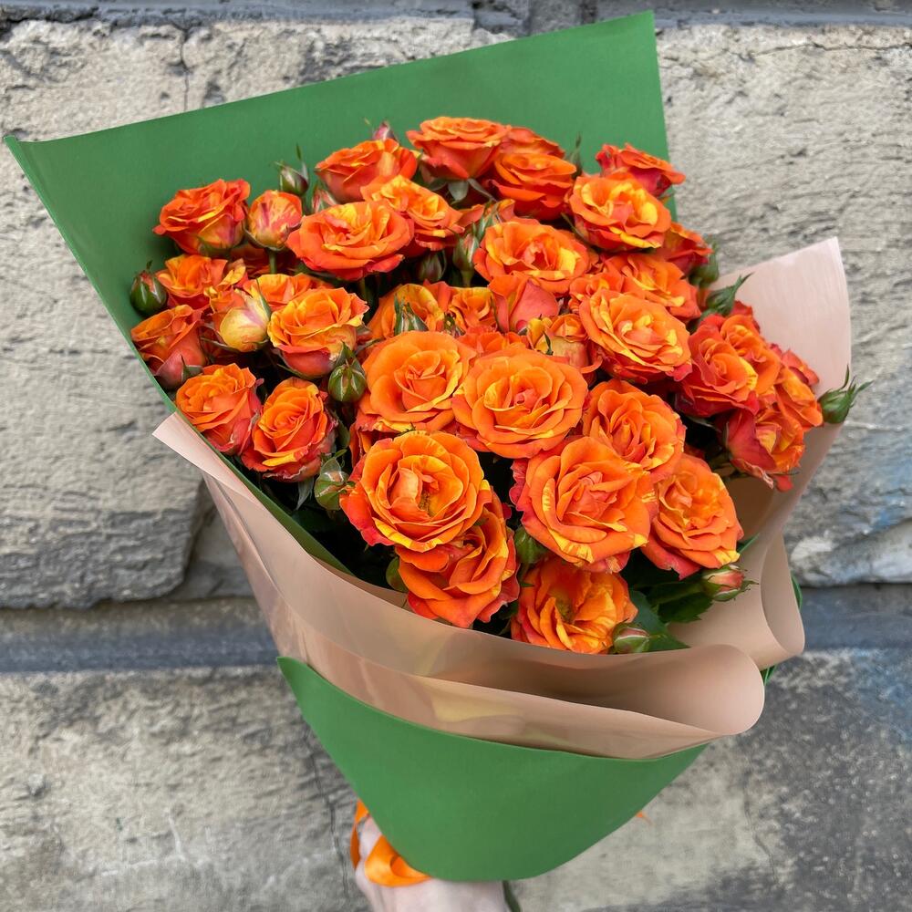 Роза кустовая – 9 шт.Фоамиран (упаковка) – 1 шт.Пленка дизайнерская – 1 шт.Лента атласная – 1 шт.