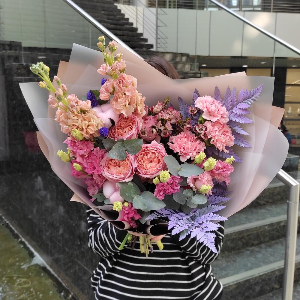 Хлопок – 3 шт.папоротник крашенный – 3 шт.Маттиола – 2 шт.Ваксфлауэр – 1 шт.Роза пионовидная – 1 шт.Эустома – 3 шт.Упаковка дизайнерская – 3 шт.