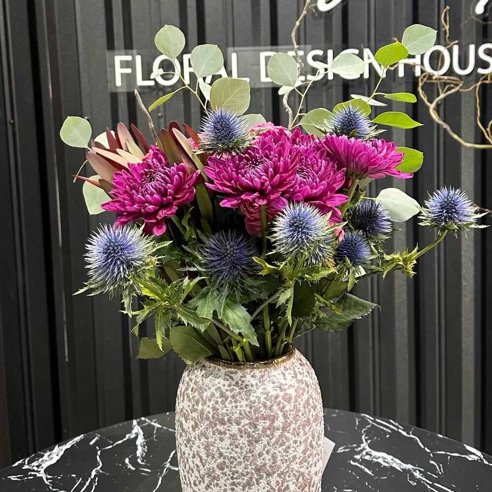 левкадендрон – 3 шт. Эвкалипт – 3 шт. Эрингиум – 3 шт. Хризантема одноголовая – 9 шт. Роза пинк флойл – 9 шт. спрей роза пионовидная – 3 шт.