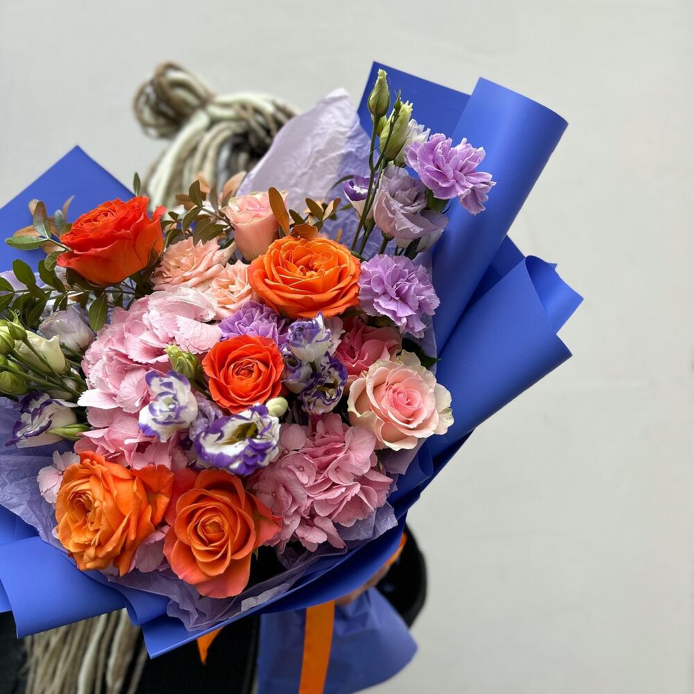 Гвоздики, Лизиантусы, Розы, Тюльпаны