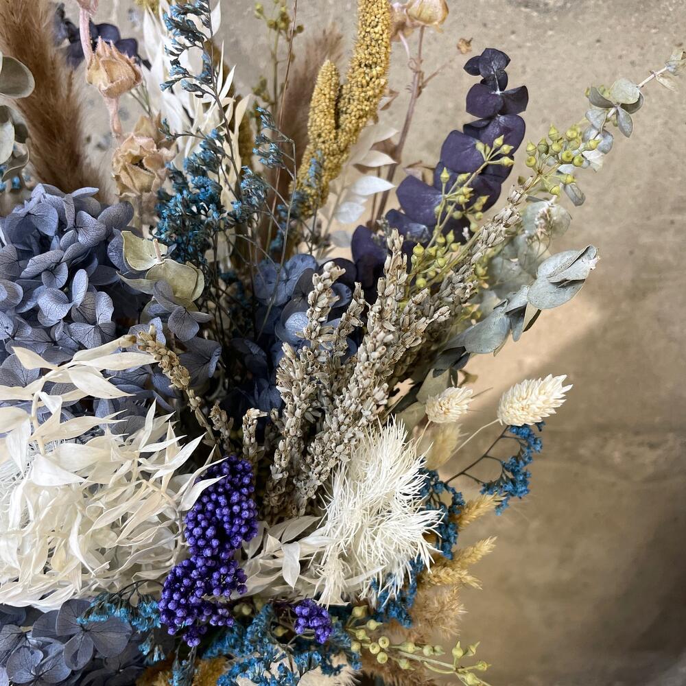 Ваза стекло – 1 шт.гортензия сухоцвет – 1 шт.Эвкалипт сухоцвет – 10 шт.рускус сухоцвет – 5 шт.аспарагус сухоцвет – 5 шт.лимониум сухоцвет – 5 шт.Лаванда пучок – 1 шт.озотамнус сухоцвет – 2 шт.сеттария – 5 шт.Ковыль – 1 шт.Лента атласная – 1 шт.