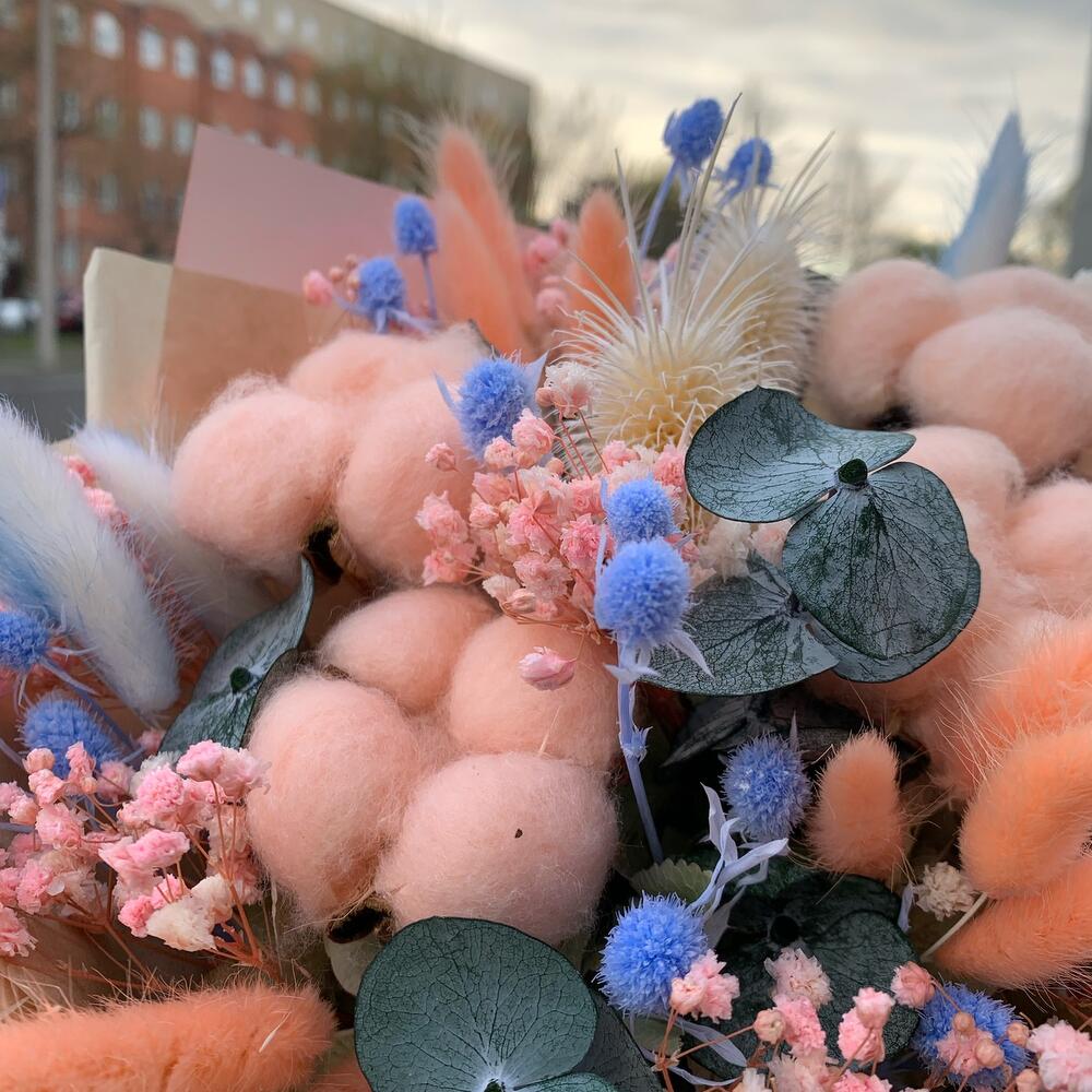 Хлопок (сухоцвет) – 5 шт.синеголовник стабилизированный – 7 шт.Эвкалипт стабилизированный – 6 шт.Гипсофила – 1 шт.Лагурус – 17 шт.эрингиум выбеленный – 2 шт.гортензия сухоцвет – 1 шт.тишью натуральная – 1 шт.Пленка матовая – 1 шт.Лента атласная – 2 шт.